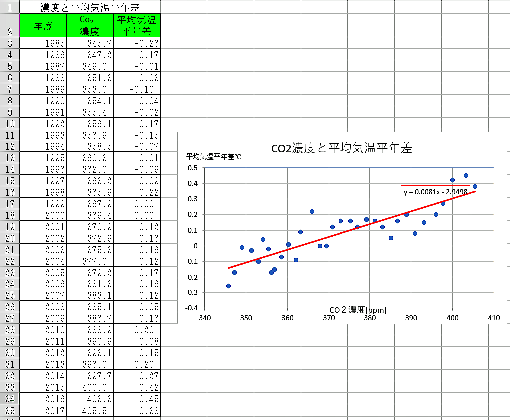 例題2 例題1で作成したグラフを用いて、CO2濃度(全球平均値)と平均気温平年差間の