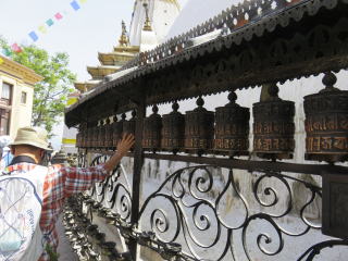 | 駐車場下車して、丘の頂きに行きます。 | 丘の頂きを目指して、もうすぐです。 | マニ車を回しながらお参りをする人々 |