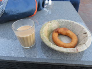 | 夕日が素晴らしかった | 民族衣装の帽子をかぶっているタッチ | ホテルのテラスで、 チャイ(ミルクティ)&揚げパン |