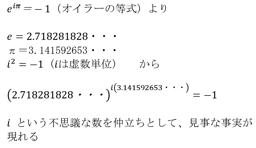 摩訶不思議な等式である。(2.718281828・・・)のi(3.141592653・・・)乗が-1となる。